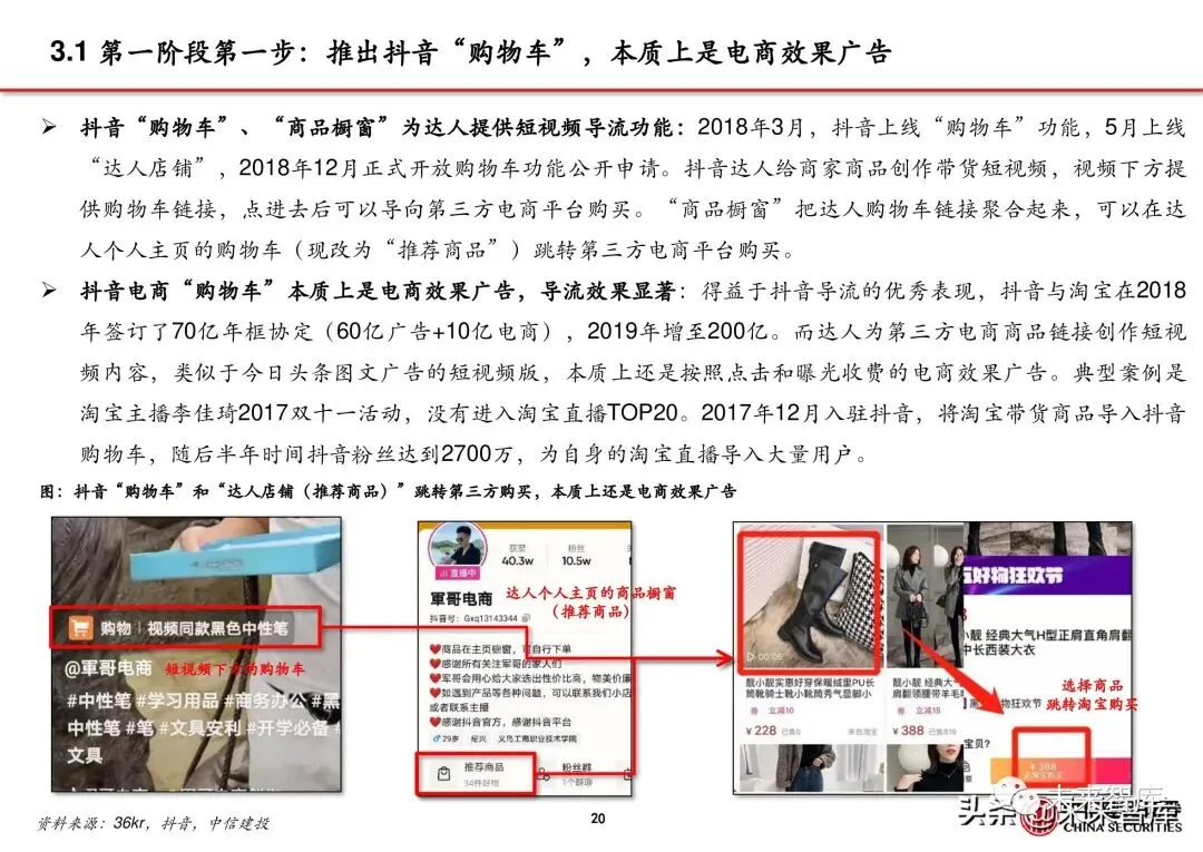 1)抖音初期上线了达人“购物车”功能,用于帮助第三方商家接入达人跳转交易。