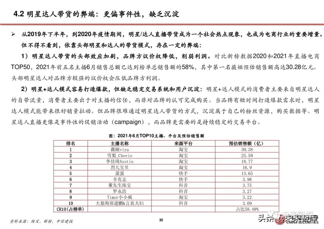 1)明星达人带货的头部效应加剧,品牌方议价权降低,削弱利润。对比新榜数据2020和2021年直播电商 TOP50,2021年前五名主播6月销售总额已达到榜单总销售额的58%,其中第一名薇娅预估销售额高达30.28亿元。头部明星达人对品牌方较强的议价权会压低品牌方利润。