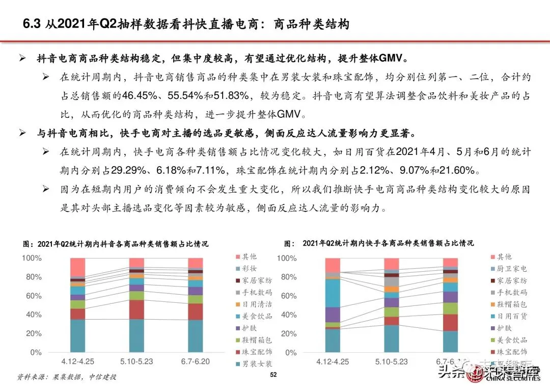 因此,从商品来源来看,抖音的直播电商不依赖外部平台,闭环已建设完成。而快手和外部电商平台的合作 更多,商品来源更为丰富。