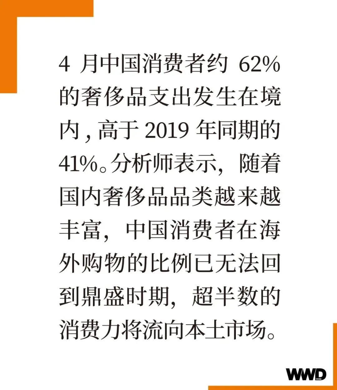 上海正在以迅猛之速带动时尚产业复苏,本次五五购物节在消费券、商家活动等手段的强刺激下,对于第一季度的消费态势有进一步的助推效果。据全球大数据服务平台和洞察研究机构 SandalwoodAdvisors 数据显示:4 月中国消费者约 62% 的奢侈品支出发生在境内,高于 2019 年同期的 41%。分析师表示,随着国内奢侈品品类越来越丰富,中国消费者在海外购物的比例已无法回到鼎盛时期,超半数的消费力将流向本土市场。