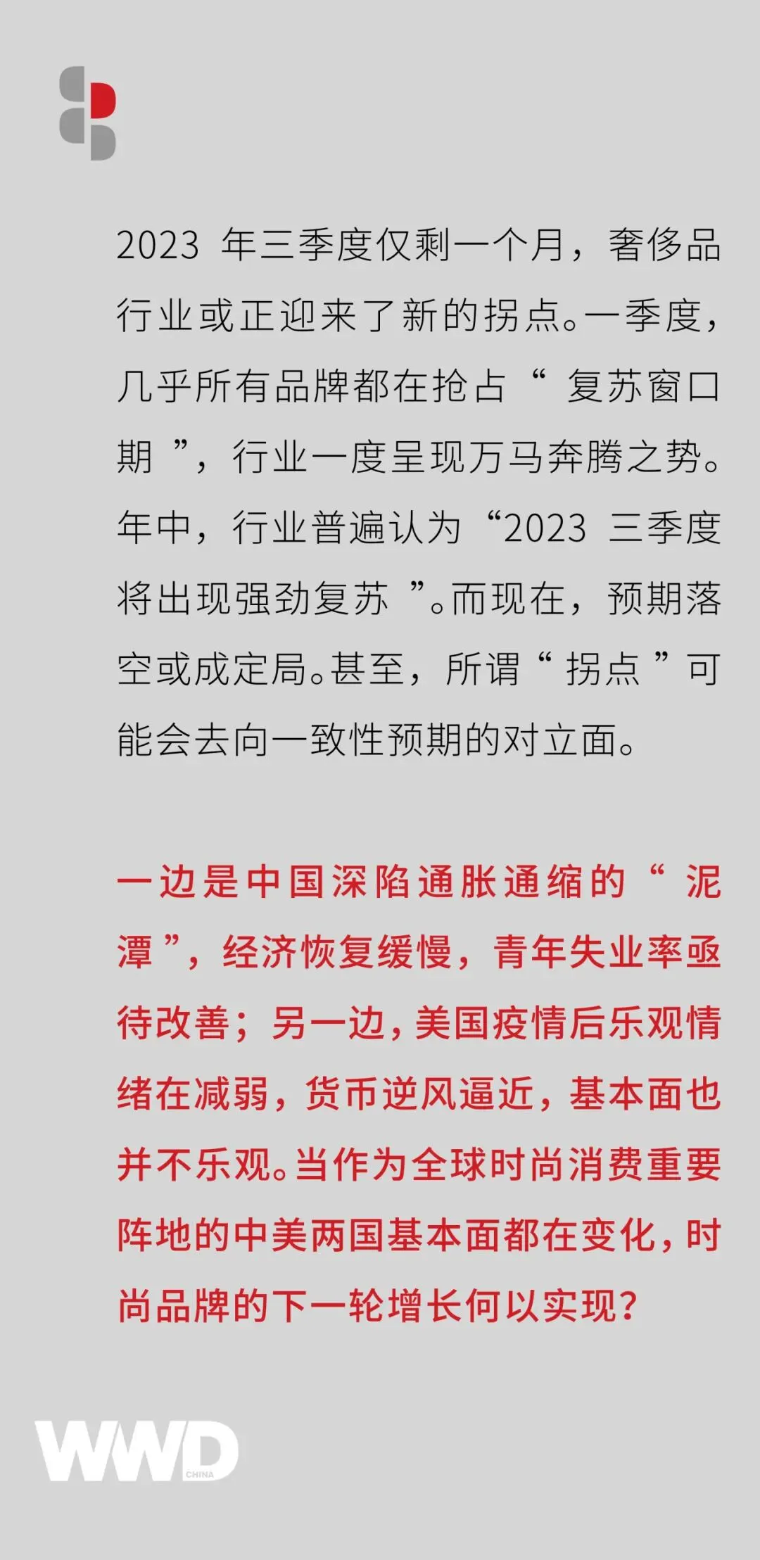 在全球范围内,奢侈品消费者正从 YOLO 主义、“疫情后的欣快感”或报复性消费中清醒过来。此时,曾在过去多年营收逐步高企的奢侈品行业乃至大时尚产业将会去向何方?全球目光都回到了中国和美国的基本面上。