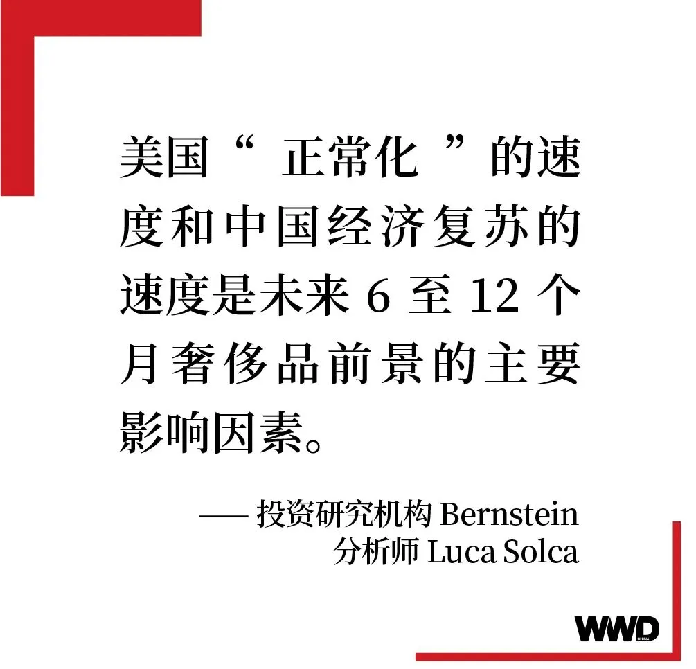 而据投资研究机构 Bernstein 的分析师 Luca Solca 在最近的一份报告中表示:“美国回到了‘稳定状态’,这意味着随着奢侈品支出的正常化,基本面再次变得重要。”他明确指出,美国“正常化”的速度和中国经济复苏的速度是未来 6 至 12 个月奢侈品前景的主要影响因素。