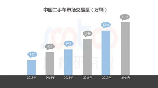 根据中国二手车市场交易量数据显示,中国二手车市场交易量在2013年仅有847万辆,2016年突破1000万辆,随后以超过10%的增长率增长,2017年达到1240万辆,2018年则达到1382万辆。