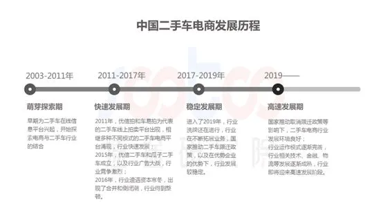 2011年,优信拍和车易拍等二手车线上拍卖平台出现,随后相继出现多种不同模式的二手车电商平台,行业进入快速发展阶段。2015年,优信二手车和瓜子二手车成立,并且行业开始了广告大战,竞争加剧。行业发展过快,就很难躲开路边的陷阱,2016年,二手车电商行业遭遇了资本寒冬,出现了合并和倒闭潮,市场也在一定程度上完成了洗牌。