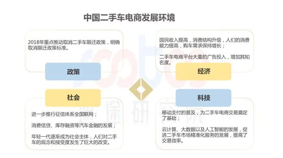 2018年,商务部加快修订《二手车流通管理办法》,使得二手车交易更加规范和标准,同年3月,政府工作报告提出全国取消二手车限迁政策,国家政策的利好下,二手车市场将更加活跃。二手车电商平台大量的广告投入,增加其知名度,再加上国民经济的发展,消费者消费能力提高,购车需求保持增长,给二手车电商发展提供了市场。此外,科技的进步以及人们对二手车的观念改变,接受度提高,都促进了二手车电商行业的发展。