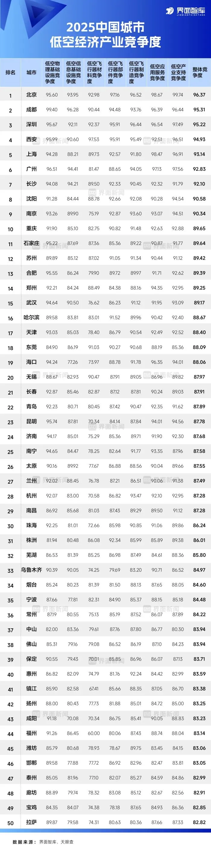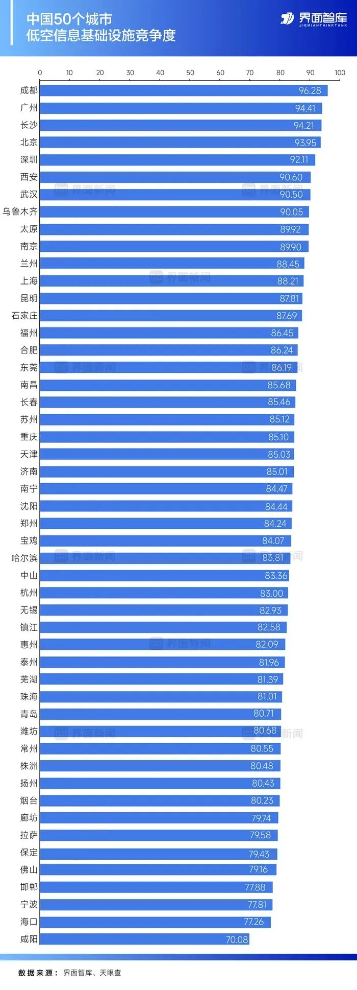 结果显示,中国低空经济产业的城市竞争版图呈现鲜明梯队格局。北京以96.37分高居榜首,成都(95.31分)、深圳(95.22分)紧随其后,西安(94.93分)、上海(93.14分)分列第四、第五。前50入围门槛为拉萨的82.82分。