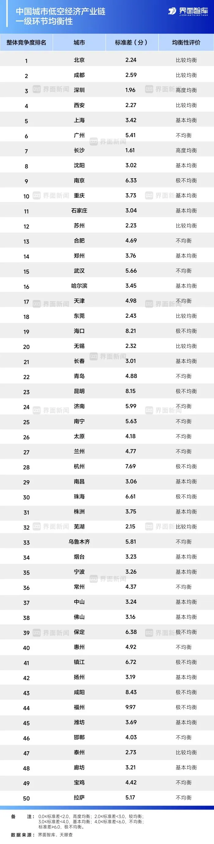 基于七个产业链一级环节的竞争度得分情况分析,头部阵营的深圳与长沙的产业链布局“高度均衡”,标准差分别为1.96分和1.61分,这验证了产业发展的黄金定律——单点突破终有上限,生态协同方为护城河。在头部阵营中,广州和南京的产业链均衡性表现不尽如人意。排名中游的部分城市其产业链断层危机尤为显著,比如海口(标准差8.21分)、杭州(标准差7.69分)和珠海(标准差6.61分)陷入“极不均衡”陷阱,其发展共性在于过度依赖政策红利或单一环节,而在低空飞行器材料等环节的发展明显滞后。