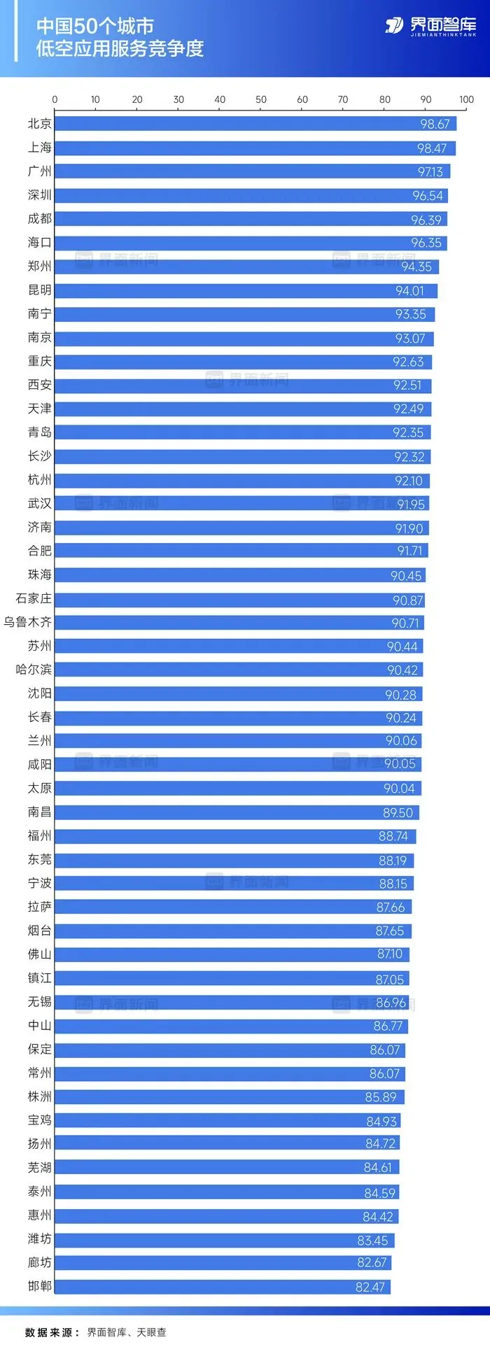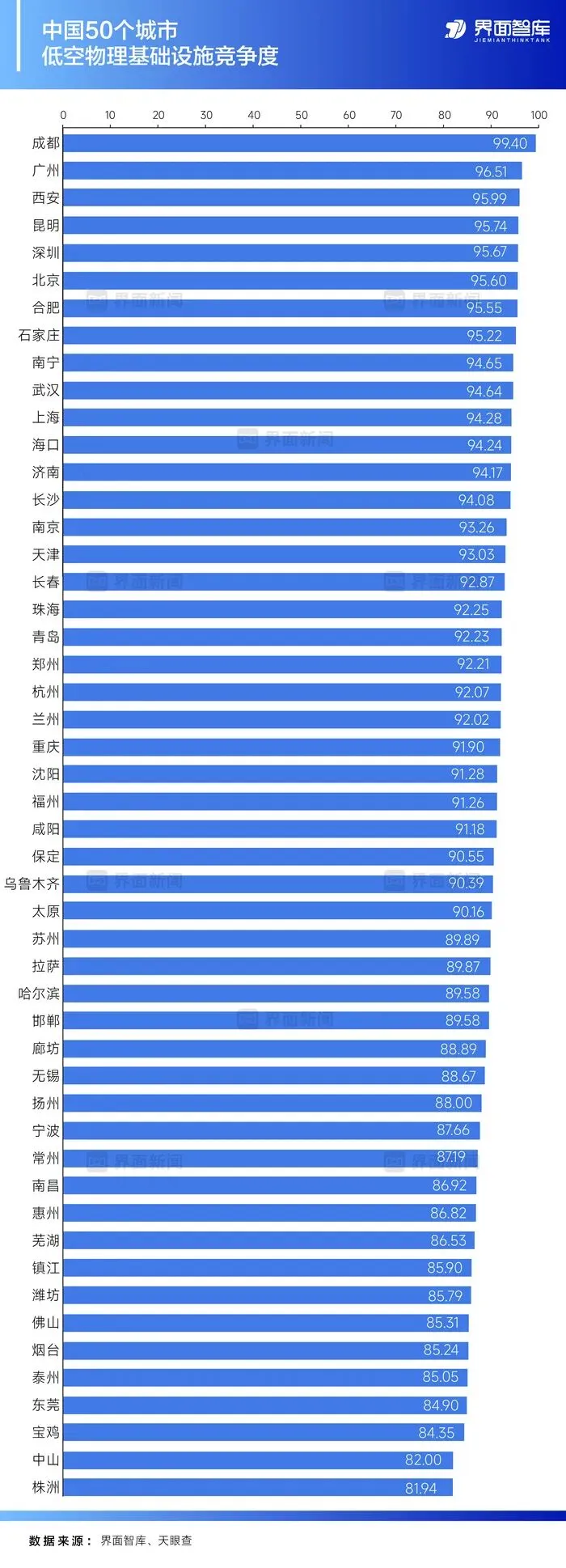 值得关注的是部分城市的异军突起。昆明凭借航空枢纽定位和跨境物流硬需求,以95.74分跻身第四;石家庄则借力京津冀协同政策大力发展通用机场群建设而冲入前十。