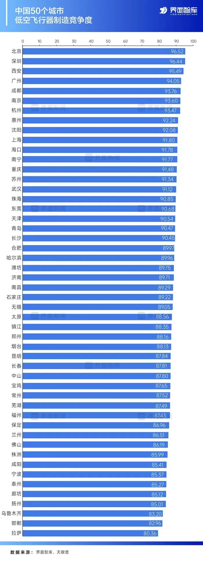在低空飞行器制造领域,北京与深圳分别以96.52分与96.44分的胶着姿态占据行业顶端,西安(95.49分)与广州(94.05分)紧随其后,而榜单后半段出现断崖式滑坡,揭示低空制造领域资源要素高度向超大城市聚集的现实。更具警示意义的是,传统制造重镇集体哑火,苏州(91.34分)仅列第14,无锡(89.05分)列第28,长三角“世界工厂”光环在低空制造领域稍显黯淡。