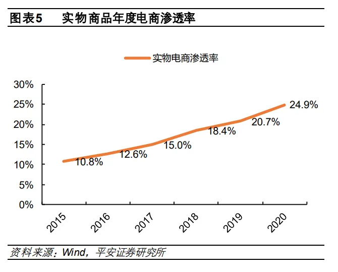 电商规模逐步扩大,渗透率持续提升。从规模看,实物网上销售额从 2015 年的 3.24 万亿提升至 2020 年的 9.76 万亿 (2020 年社会零售总额达 39.2 万亿),电商规模逐步提升。从电商渗透率看, 实物网上销售额占社会零售总额比例从 2015 年的 10.8%逐步提升至 2020 年的24.9%,渗透率持续提升。