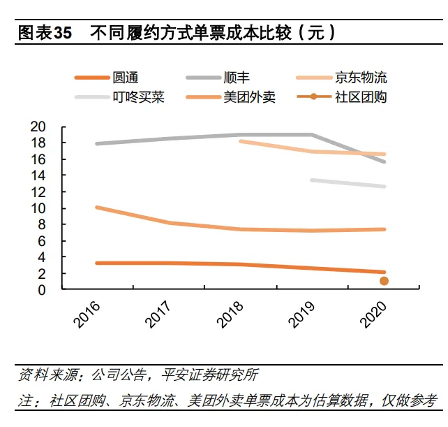 不同履约方式成本不同,规模效应和最后一公里配送方式为关键影响因素。目前主流履约方式主要有四种,按成本由低到 高分别是社区团购类、通达系、京东式、以及即时配送。社区团购构建“中心仓-网格仓-自提点”三级结构物流体系,通达 系快递采用干线运输+末端收派件的方式进行运转,京东采取仓储辐射式履约方式,即时配送以叮咚买菜和美团外卖为代表, 由骑手完成最后一公里的配送。由于各模式运转方式的差异,单票成本有明显异,总的来说,集单(规模)效应和最后一 公里配送方式对成本影响最大。社区团购以中心仓(一省一仓/一省两仓)为基础进行集单并通过自提的方式解决最后一公 里高昂的成本,通达系快递通过干线集单的规模效应有效降低了干线物流成本。京东仓配一体的快递模式决定其履约成本主要来自于仓储和配送。即时配送缺乏集单效应(每个配送员每次最多配送低个位数订单),单票成本相对较高。2020 年, 社区团购、圆通、京东物流以及叮咚买菜的单票成本分别为约 1.1元、2.1元、16.7 元和 12.7 元。