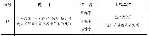 近日,第五届全国“一带一路”城市智库联盟大会优秀论文评选结果公布,我市新型智库“温州产业经济研究所”提交的《关于深化“AI+文化”融合 助力打造人工智能创新发展先行市的建议》一文,获评三等奖。