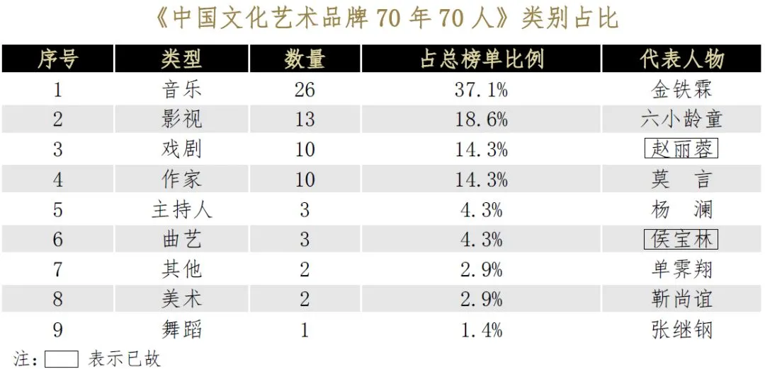 从《中国文化艺术品牌70年70人》的品牌人物领域类别可以看出,音乐类别有26人上榜,在所有类别中位列第一位,占所有类别的比例是37.1%;影视类别、戏剧类型、作家类别、主持人类别、曲艺类别、其他类别、美术类别和舞蹈类别上榜的数量分别是13人、10人、10人、3人、3人、2人、2人和1人,占所有类别的比例分别是18.6%、14.3%、14.3%、4.3%、4.3%、2.9%、2.9%和1.4%。上榜的中国文化艺术品牌人物都在各自的工作岗位上做出了平凡的成就,他们塑造了社会的正能量,是时代的先锋,是民族的楷模。