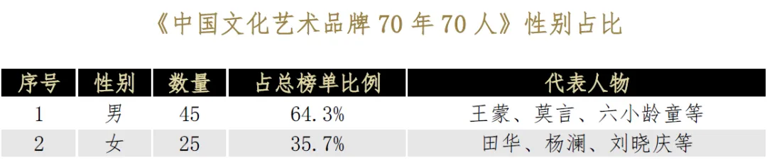 从《中国文化艺术品牌70年70人》的品牌人物性别可以看出,男性入选中国文化艺术品牌人物略多,入选45人,占总数的比重是64.3%;女性入选25人,占总数的比例是35.7%,其中杨澜(2008中国十大品牌女性)和刘晓庆(2012中国十大品牌女性)曾是品牌联盟十大品牌女性获奖者,入选的女性品牌人物是中国最美丽、最善良的女性群体。