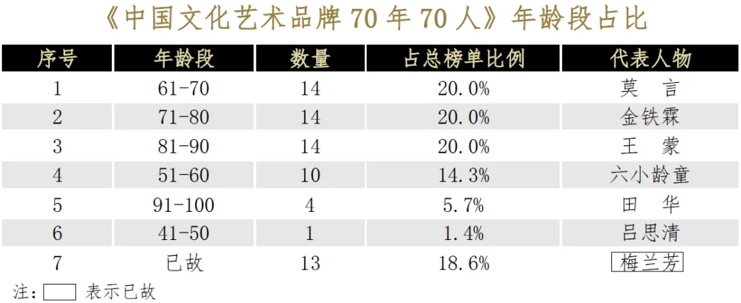 从《中国文化艺术品牌70年70人》的品牌人物年龄分布可以看出,文化艺术品牌人物一共有70人上榜,57人在世,13人离世,在世的文化艺术品牌人物年龄分布是:61-70岁年龄段、71-80岁年龄段和81-90岁年龄段均有14人入选中国文化艺术品牌人物,均占总数的比例是20.0%;51-60岁年龄段有10人上榜,占总数的比例是14.3%;91-100岁年龄段有4人上榜,占总数的比例是5.7%;41-50岁年龄段有1人上榜,占总数的比例是1.4%;已故人数有13人,占总数的比例是18.6% 。