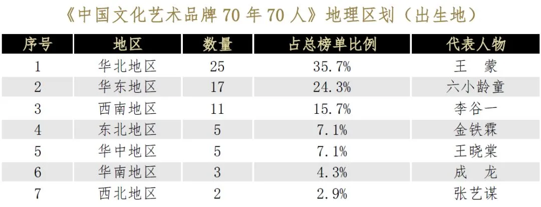 从《中国文化艺术品牌70年70人》的品牌人物出生地地理区划可以看出,华北地区是中国文化艺术品牌人物出生地会聚的地方,25人入选《中国文化艺术品牌70年70人》,占总数的比例是35.7%。华东地区、西南地区、东北地区、华中地区、华南地区和西北地区分别有17人、11人、5人、5人、3人和2人入选,占总数的比例分别是24.3%、15.7%、7.1%、7.1%、4.3%和2.9%。
