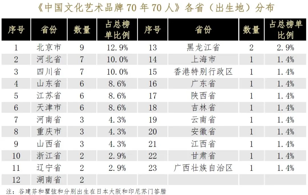 从《中国文化艺术品牌70年70人》的品牌人物出生地各省分布可以看出,位列上榜中国文化艺术品牌人物数量前十的省份分别是:北京市、河北省、四川省、山东省、江苏省、天津市、河南省、重庆市、山西省和浙江省。其中,北京市位列第一,占总榜单的比例是12.9%;河北省、四川省并列第二,均占总榜单的比例是10.0%;山东省、江苏省、天津市并列第三,均占总榜单的比例是8.6%。其他各省在《中国文化艺术品牌70年70人》中所占的比例分别从4.3%到1.4%不等。