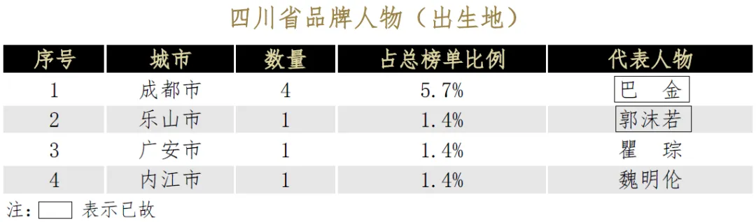 在《中国文化艺术品牌70年70人》品牌人物中,共有7个中国文化艺术品牌人物出生在四川省,其中出生在成都市的文化艺术品牌人物有4名,占榜单总数的比例是5.7%,是四川省中国文化艺术品牌人物最多的出生城市。乐山市、广安市和内江市分别位列四川省中国文化艺术品牌人物出生城市的第2名到第4名,分别有1名、1名和1名中国文化艺术品牌人物上榜。