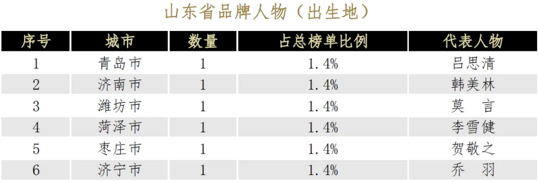 在《中国文化艺术品牌70年70人》品牌人物中,共有6个中国文化艺术品牌人物出生在山东省,出生在青岛市、济南市、潍坊市、菏泽市、枣庄市和济宁市的中国文化艺术品牌人物均有1人,均占榜单总数的比例是1.4%。