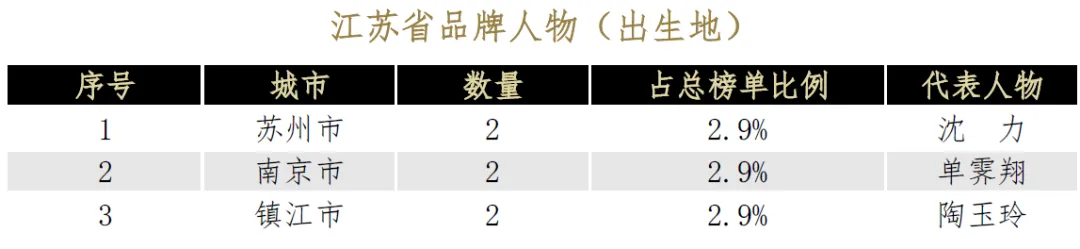 在《中国文化艺术品牌70年70人》品牌人物中,共有6个品牌人物出生在江苏省,出生在苏州市、南京市和镇江市的文化艺术品牌人物均有2名,均占榜单总数的比例是2.9%。