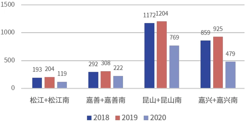 图 2 松江新城与周边城市铁路客站年旅客发送量对比(单位:万人次/年)
