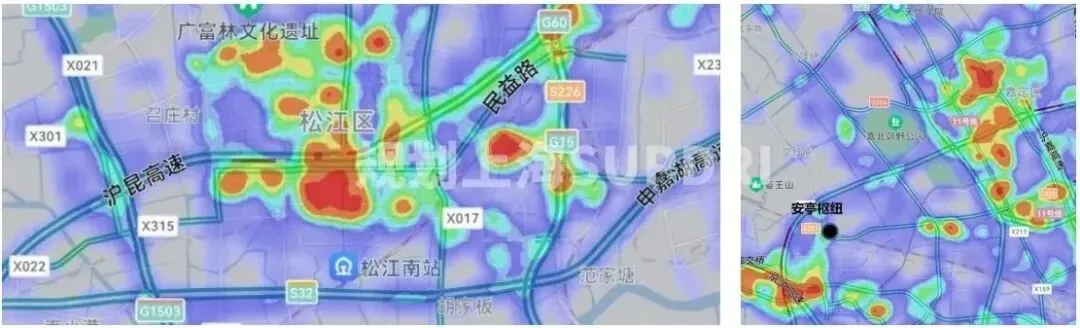 图 3 松江南(左)及安亭枢纽(右)周边早高峰客流热力图