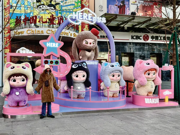 作为北京商业的标志性街区,王府井提前开启“节日模式”。钟楼前的裸眼3D大屏吸睛无数,“我在北京”的字样随动态画面流转,科技感拉满,吸引行人驻足围观,成为街头最亮眼的“流量担当”。传统与新潮在此碰撞出别样火花,潮玩品牌“HERE奇梦岛”全国直营店的打卡点“圈粉”无数,不少外国游客驻足其间,举着手机定格光影。