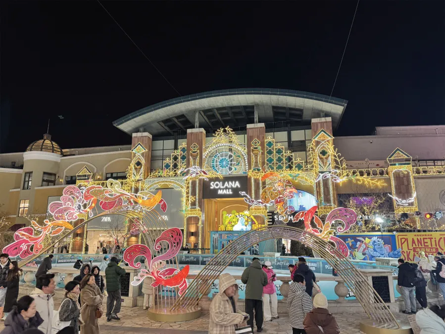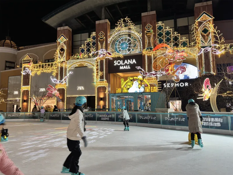 与传统商圈不同,时尚商圈则以多元体验为节日消费市场注入新活力。蓝色港湾的灯光秀如期而至,璀璨的光影交织成梦幻画卷,市民们三五成 群举起手机拍照打卡,定格浪漫瞬间。一旁的滑冰场上,孩子们穿着冰鞋肆意嬉戏,欢声笑语穿透夜色,温馨的亲子时光为节日增添了更多暖意。