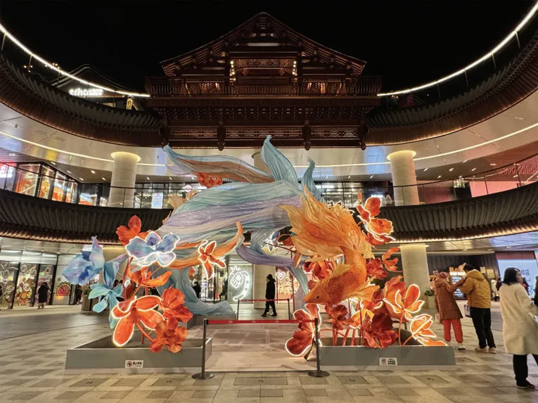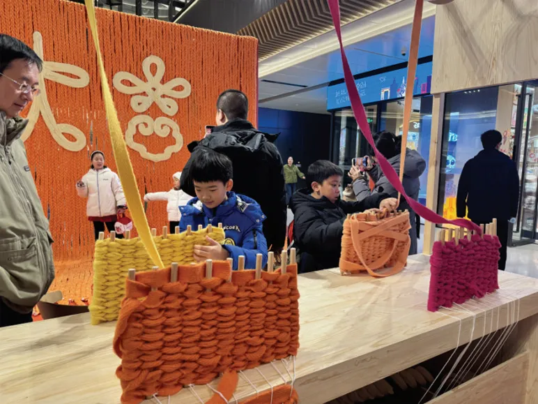 中海大吉巷内也别有洞天,“鲤游幻境”灯光装置将街巷打造成了一个奇幻秘境。“中国绳结非遗 体验”专区前,孩子们认真学习绳结技艺,在动手实 践中感受传统非遗的独特魅力,文化体验与亲子互动的结合,让节日消费更具温度与意义。