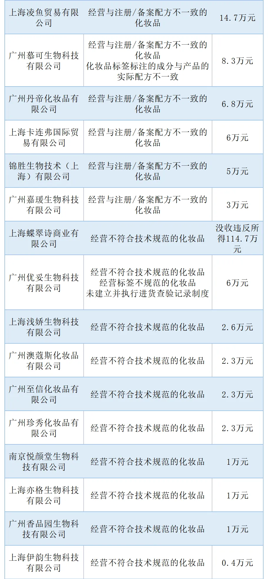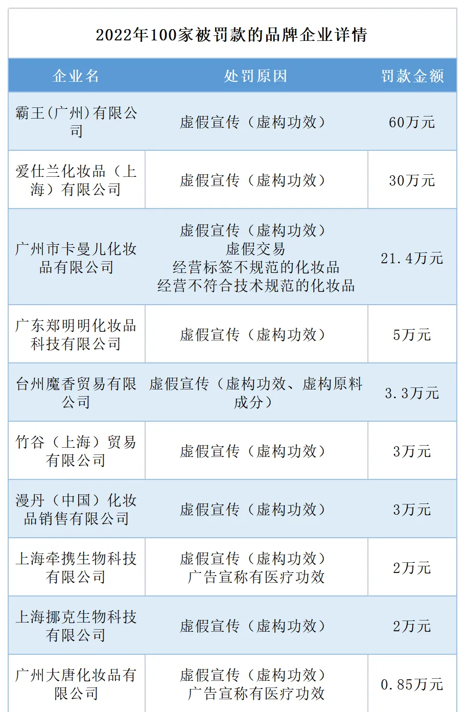 根号C(ID:sqr-cosmetics)统计了在2022年被罚款的100家化妆品品牌企业,其中既涉及皮尔法伯(雅漾母公司)和科蒂等知名的外资品牌企业;也包括了上海铂舍生物科技有限公司(听研品牌母公司)和霸王等本土品牌企业。通过分析这些品牌企业被罚款的原因,能够让其它企业尽可能避免因违规而被罚款。