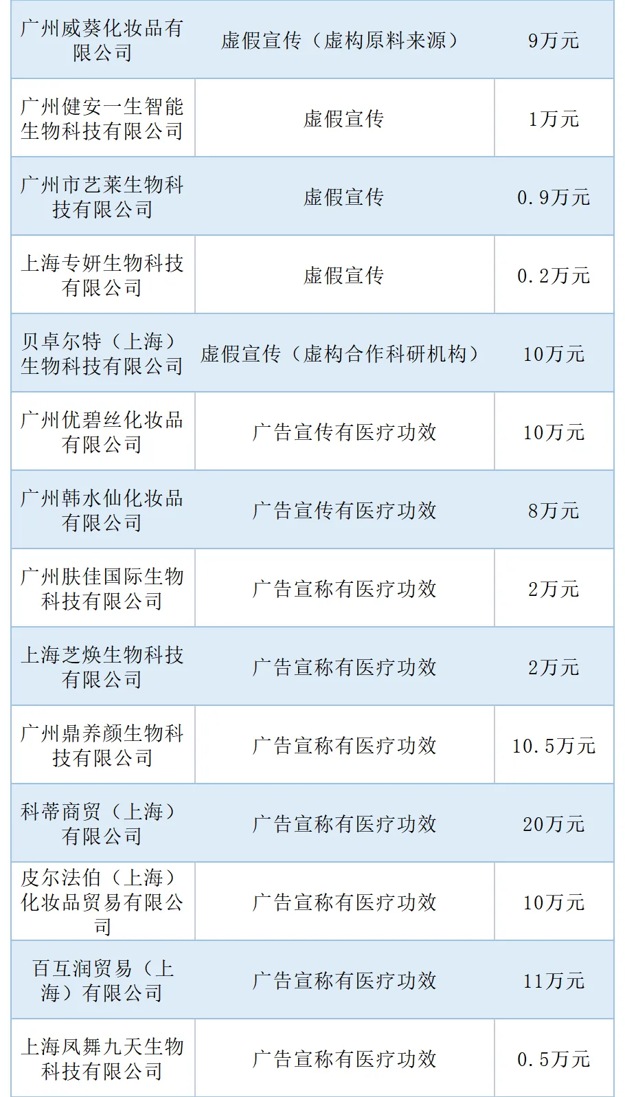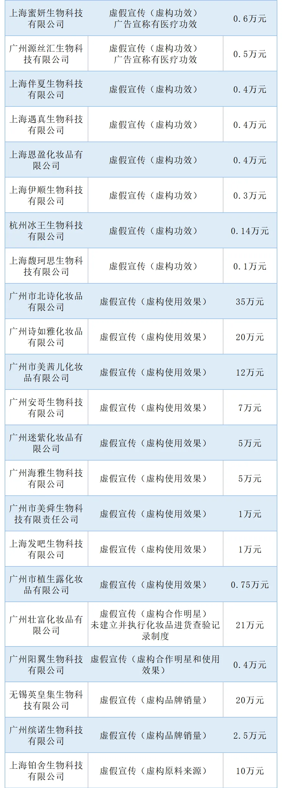 除此之外,虚构使用效果也是一类很常见的虚假宣传,有10家企业因此被罚。比如广州诗如雅化妆品有限公司在自己经营网店中,宣称其旗下品牌“美迪智”的多款产品,拥有“+25%水润度提升、+13%亮白提升、-15%暗沉”的使用效果,但却没有相关证据来证明数据的真实性,因此被判定为虚假宣传,罚款20万元。