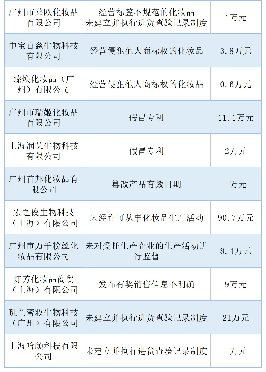 但在这100家企业中,依然有4家在生产环节“掉链子”。其中有2家品牌企业委托的工厂,没有取得相应化妆品生产许可。以广州十二蓝化妆品有限公司为例,它委托广州某工厂生产“御之坊植物草本艾粉”,该产品属于化妆品粉单元类别,但该工厂并未取得粉单元类别的生产许可。而作为备案方的广州十二蓝化妆品有限公司要承担主要责任,因此被罚8.7万元;另外广州市众彩化妆品有限公司也因为同样的原因被罚6万元。