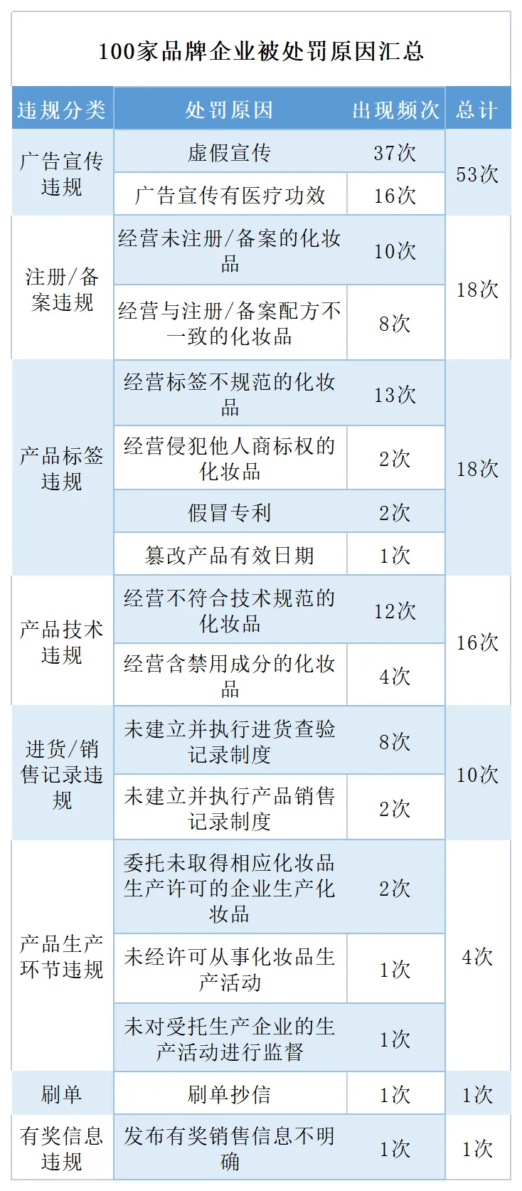 另外,有些品牌企业为了缩减成本,甚至敢在生产环节铤而走险,而宏之俊生物科技(上海)有限公司就是典型案例。其为了节省加工成本,直接从广州某化妆品公司购进原液,然后擅自进行灌装并售卖,被判定为“未经许可从事化妆品生产活动”,罚款90.7万元,成为100家品牌企业中被罚款金额最高的一家。