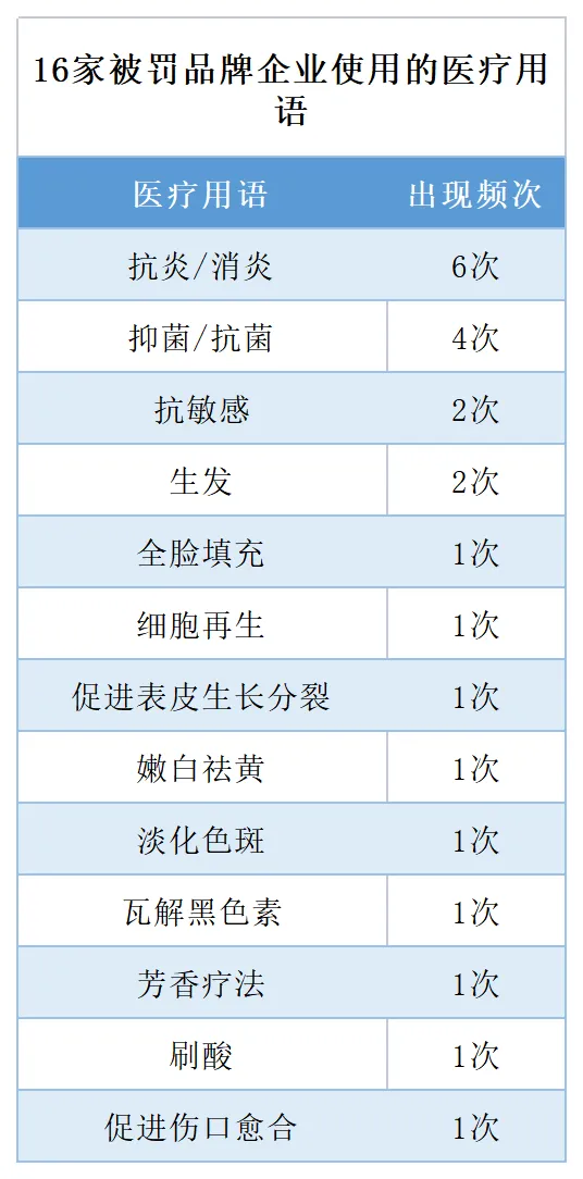 从这16家因“广告宣传有医疗功效”而被罚款的品牌企业来看,“抗炎/消炎”是出现频率最高的医疗用语;排第二的是“抑菌/抗菌”;而“抗敏感”和“生发”则并列第三位。值得注意的是,还有很多与之相近的词汇也是被禁止的,比如除菌、灭菌、防菌,以及抗敏、防敏、脱敏。