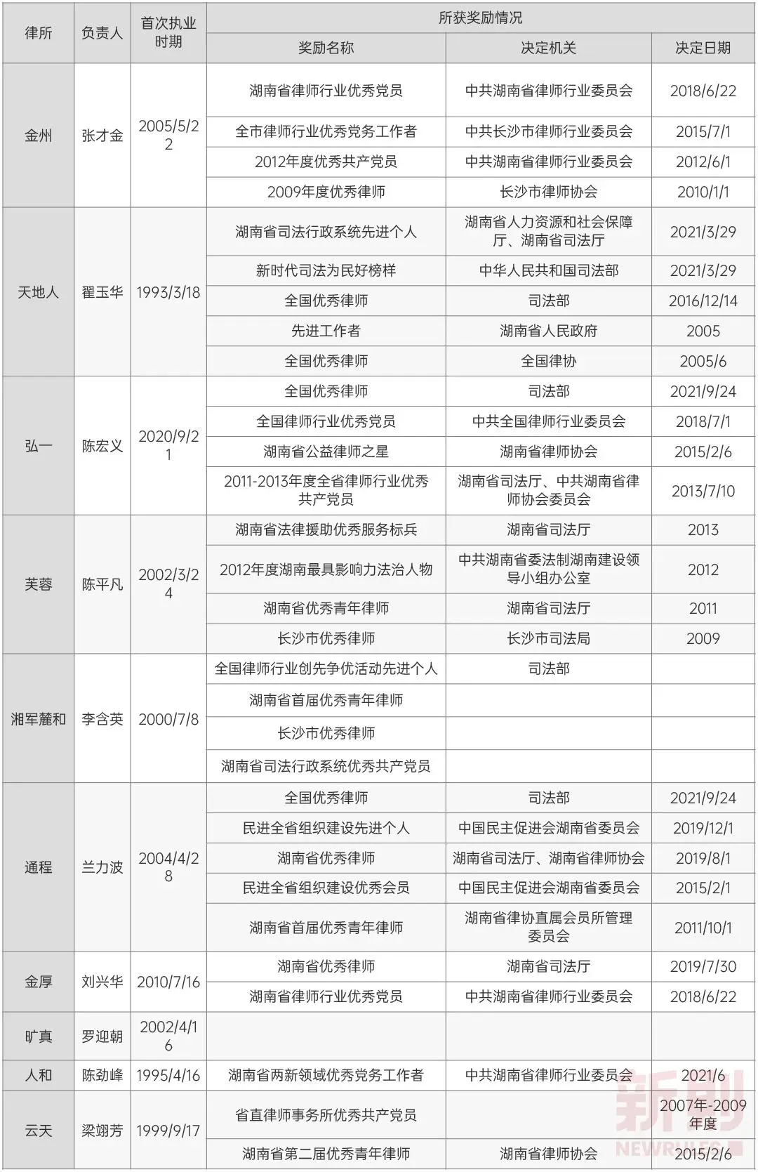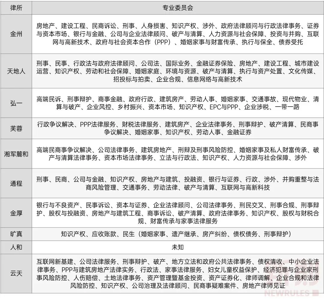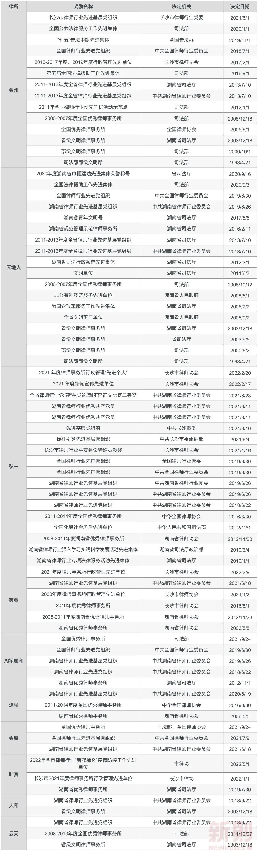 而从10家律所专业委员会设置情况,我们可以发现各规模律所均或多或少地回应了规划的要求:① 涉外业务:如金州律所的涉外专业委员会、天地人律所的国际业务专业委员会、弘一律所的一带一路专业委员会等。② 信息服务业务:如金州律所的互联网与高新技术专业委员会、天地人律所的信息网络与高新技术专业委员会、通程律所的互联网与高新科技专业委员会、云天律所的互联网新基建专业委员会。③ 文化创意业务:如天地人律所的文化传媒专业委员会。④ 生态环境业务:如天地人律所的环境与资源专业委员会。此外,各规模律所几乎均设置有金融证券、知识产权等专业委员会,而最近一两年大热的合规业务也引起了规模律所的注意,如天地人律所设有企业合规专业委员会、金厚律所设有刑事合规专业委员会和股权与财税合规专业委员会。参与榜单与评级,是律师事务所面向客户与同行,展示专业水平的最直观的方式。由于缺少本土的有公信力的市场化评级机构,目前国内律师事务所和律师评奖榜单几乎被境外评级机构所垄断,包括钱伯斯(Chambers and Partners)、亚洲法律杂志(ALB)、The Legal 500、LEGALBAND等。一直以来,各大榜单都是规模律所的角逐场,除有特色的精品律所外,中小型律所往往无缘榜单与评级。换个角度,规模律所要获得更大品牌影响力,可以有意识地参与榜单与评级。然而,我们检索了湖南10家本土规模律所的获奖情况,发现仅天地人律所有过评奖记录:- 曾获钱伯斯《2020亚太法律指南》《2021亚太法律指南》公司/商事中部Band 1律师事务所、《2022钱伯斯大中华区法律指南》公司商事·湖南Band 1律师事务所,天地人党委书记、主任翟玉华获“公司/商事中部(湖南)Band 1律师”、“公司商事·湖南业界贤达”多个称号,天地人合伙人李明律师多次荣获“公司/商事中部(湖南)Band 2律师称号,天地人合伙人唐学锋、刘玉春等多名律师荣获“公司商事·湖南Band 2律师”。