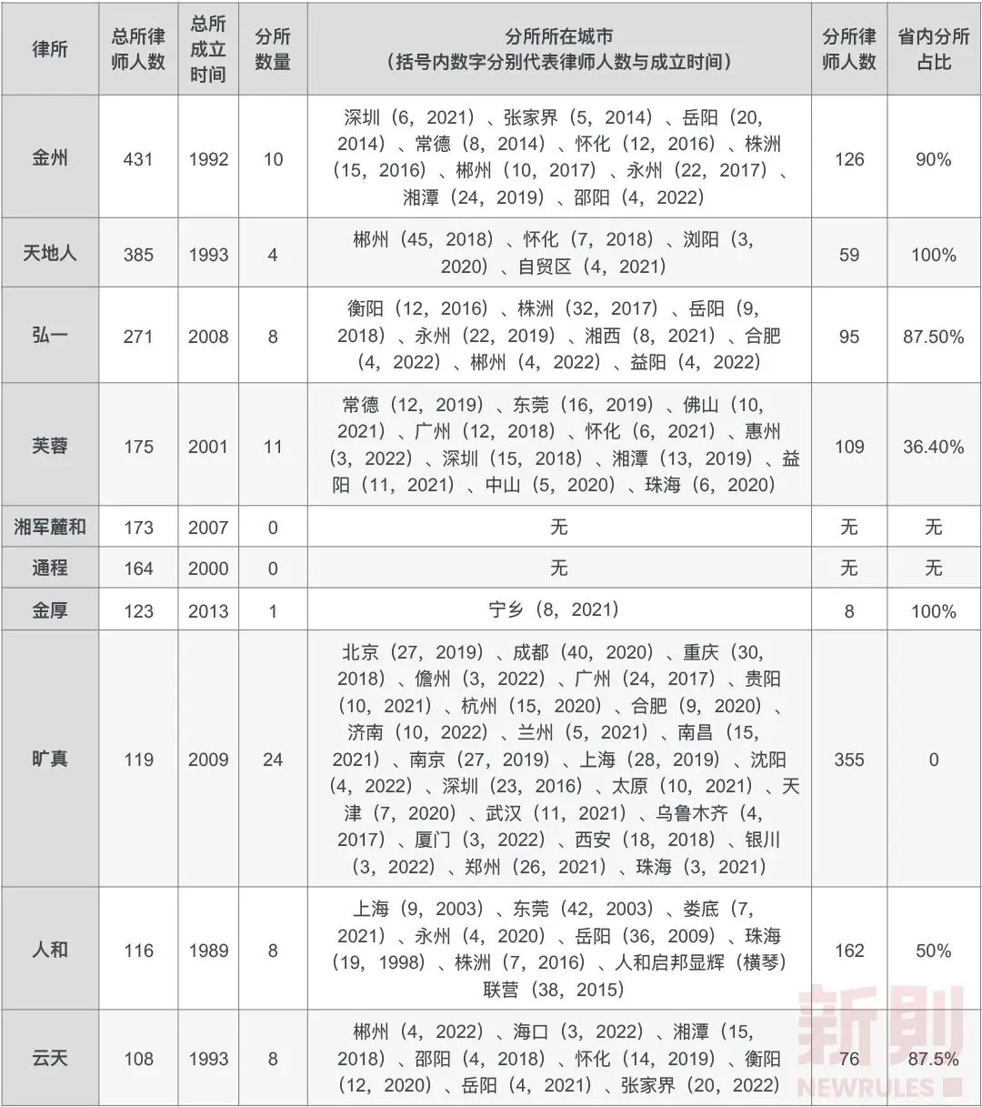 惟楚有材,于斯为盛。湖南省地处中原偏南地区,不如东部富庶地区得天独厚的地理优势和历史积淀,但依然凭借自身实力,成为中部地区的显著经济增长点。2021年,湖南省实现地区生产总值46063.09亿元,同比增长7.7%,GDP总量在全国各省、直辖市中排名第9;在中部9省中仅次于河南、湖北,排名第3。与经济发展速度相适配,截至2020年底,湖南专职律师人数达16220名,在全国各省、直辖市中排名第10,与名列前茅的广东、江苏、浙江等省相比依然有不小差距。2021年8月,湖南省律师协会发布了《湖南省律师行业发展规划(2021-2025年)》,根据规划内容,至2025年,全省律师人数要达到3万人;律师事务所规模化、专业化、规范化、品牌化建设全面推进,全省建设100家拥有50名律师以上、规范管理水平高、法律服务能力强的大中型律所,其中拥有100名律师以上的律所要达到25家。值得注意的是,在湖南省深入推进律师事务所“四化”战略中,“规模化”被排在首位。无论是在区域法律服务市场还是全国法律服务市场,“做大做强”正逐渐成为律所发展的共识。更多的律师人数、更强的专业水平、更高的抗风险能力、更大的品牌价值,意味着能获得更多客户青睐、更大的发展机会。然而,虽然北京上海的规模大所已强势进军区域法律服务市场,但本土大所在本地客户关系网络、本地资源支持、本地信息掌握等方面,依然具有无可取代的优势,成为支撑起区域法律服务的中流砥柱。在今天的这篇文章中,我们选取了总部位于湖南的、规模最大、实力最强的10家本土律所,从品牌竞争力的角度,通过整体品牌印象、组织架构完备、规模化扩张、专业化建设、品宣运营、社会责任承担六个维度,分析各自优势,以期为本土规模律所的发展提供一份观察样本。经过数据统计、信息梳理、对比分析,我们发现,湖南本土规模律所在打造专业品牌、创新服务模式、承担社会责任上可圈可点,但在对外品宣运营上缺乏足够动力,品牌影响力更多地辐射湖南本土,有待走向全国。