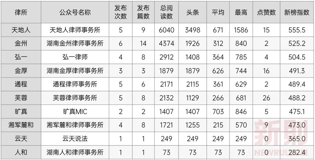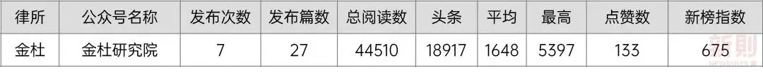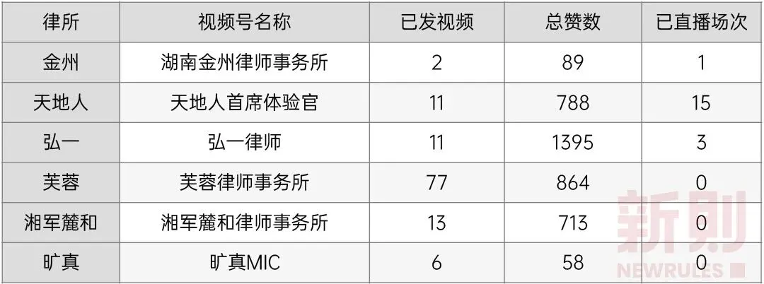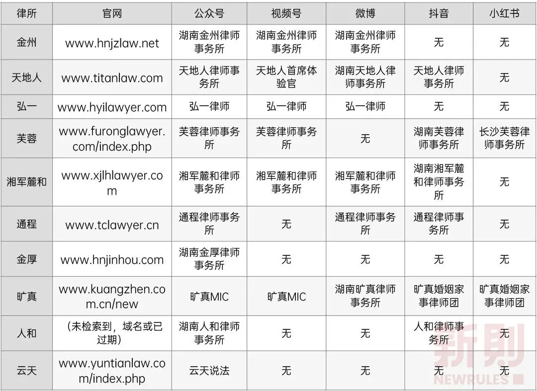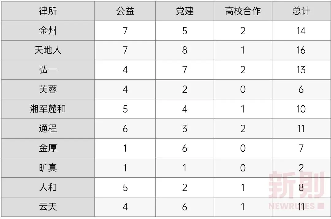 作为展示专业能力的直观指标,参与榜单和评级,应引起湖南本土规模律所的更多重视。随着移动互联网的发展和社交媒体的兴起,越来越多的律师事务所意识到通过互联网工具进行品宣运营工作的重要性。律所品宣运营工作,一方面是对外展示律所品牌形象与专业能力,吸引客户;另一方面,也达到在同行间建立影响力、吸引律师加盟、合作的目的。我们统计了10家律所的官网及主要社交媒体账号(微信公众号、微信视频号、微博、抖音、小红书)信息,可以看出,大部分律所较为重视品宣工作,开辟了多渠道账号。由于法律服务的低频、偶发、决策链条长等特性,律所运营难以走“流量”路线,且规模律所的客户多为企业客户,这就决定了律所品宣运营的主阵地仍以微信生态为主,通过社交黏性,达到潜移默化影响客户决策的目的。而事实上,当前微信公众号与微信视频号仍为律所对外输出内容的主要渠道。基于此,我们重点统计了10家律所在微信公众号与微信视频号上的内容发布情况。我们通过新媒体数据分析工具新榜,分析2022/06/27-2022/07/03一周时间里,10家律所公众号的发文与阅读量情况:从统计可得出,天地人律所在文章阅读量、点赞数等方面综合表现较好,取得了不错的传播效果;而金州律所在发文频次、数量上更多,体现了其对于公众号运营的重视程度。疫情发生后,线下市场活动受阻,许多律所将目光转向线上,微信视频号短视频、直播开始流行。我们统计了已开设视频号的6家律所的视频号运营情况:由统计得知,各律所对于视频号运营的投入有待加强,从发布视频数量与效果来看,弘一律所与芙蓉律所更突出,而从直播场次来看,天地人律所显著多于其他律所。作为对标,我们还统计了在品宣方面一直表现突出的金杜律师事务所的公众号与视频号运营情况:综上,湖南本土规模律所大多开始重视品宣运营工作,但在实际投入和效果上还有待加强。积极承担社会责任,既是律师事务所的价值所在,也是深入群众、展示律所正面形象、提升社会美誉度的重要途径。通常来说,律所履行社会责任的方式包括:进行公益普法、开展党建活动、进行高校合作、开展志愿服务、律师参政议政等。我们统计了2022/01/01-2022/07/04期间内,10家律所公众号上所发布的有关律所承担社会责任的相关内容,并进行了大致分类:由此可见,各规模律所均积极承担社会责任,树立律所良好形象,尤其在疫情期间,通过开展抗疫志愿活动、组织涉疫公益普法等,发挥了律师的专长,展现出应有的担当精神。