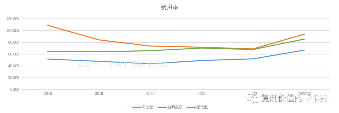 费用率——奇安信>深信服>启明星辰,奇安信近几年虽然费用率有效控制但是仍然处于较高水平,然后是深信服,这两家在研发费用和销售费用方面投入较大,而启明星辰费用控制得比较好