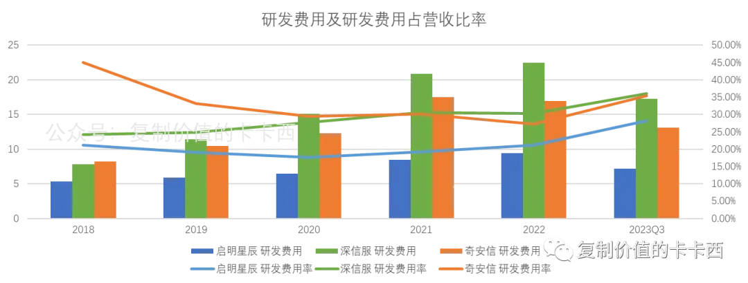 研发费用——奇安信>深信服>启明星辰,奇安信在研发费用上投入在新兴业务上较大,深信服也是,启明星辰的投入相对低一些