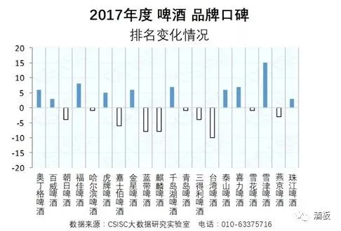 2017年度啤酒品牌口碑总指数榜单中,数据显示,与上期相比,新入榜品牌有虎牌啤酒、千岛湖啤酒;落榜品牌有慕尼黑啤酒。其中,百威啤酒、青岛啤酒、雪花啤酒品牌在口碑总指数中位居前三。