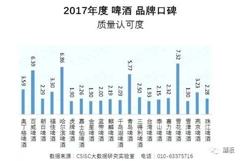 质量认可度:雪花啤酒、哈尔滨啤酒、百威啤酒品牌在质量认可度中位居前三。