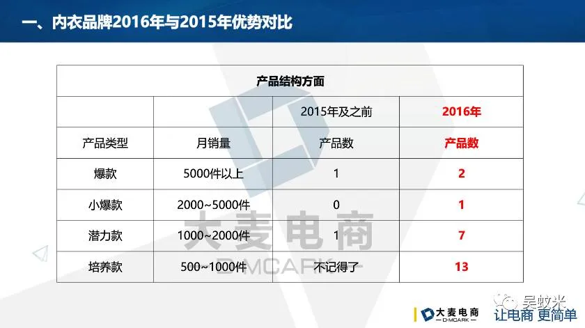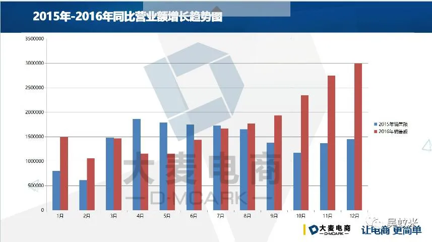 先来看一组数据,蓝色部分是2015年店铺销售额,红色部分是2016年销售额,可以看出2016年的增长幅度比较大。一般来说,内衣类目3月、4月、5月份是销售旺季,此时内衣更换频率较高,款式要求较高;9月、10月、11月是销售淡季。但是上图所示,淡季销售额已经远超出旺季,今年12月份的销售额相比于去年翻了两倍。能达到以上的销售额,导师总结了以下几点原因: