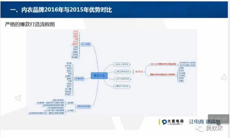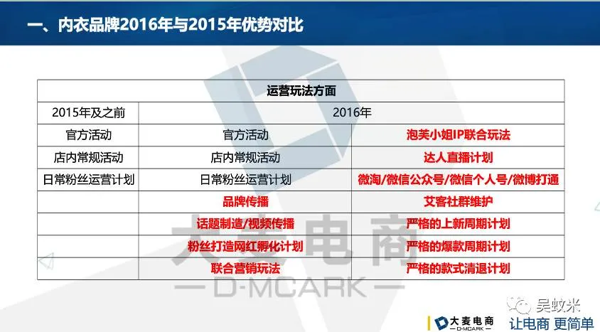 今天蚊子会会员周五内部分享课程的主要内容是《TOP内衣品牌2016年年终复盘》,以下的分享会围绕导师今年操盘的性感内衣店铺为案例做讲解。主要分为以下三方面:一、内衣品牌2016年和2015年的优势对比;二、内衣品牌网红孵化计划全过程;三。内衣品牌2016年年度总结。