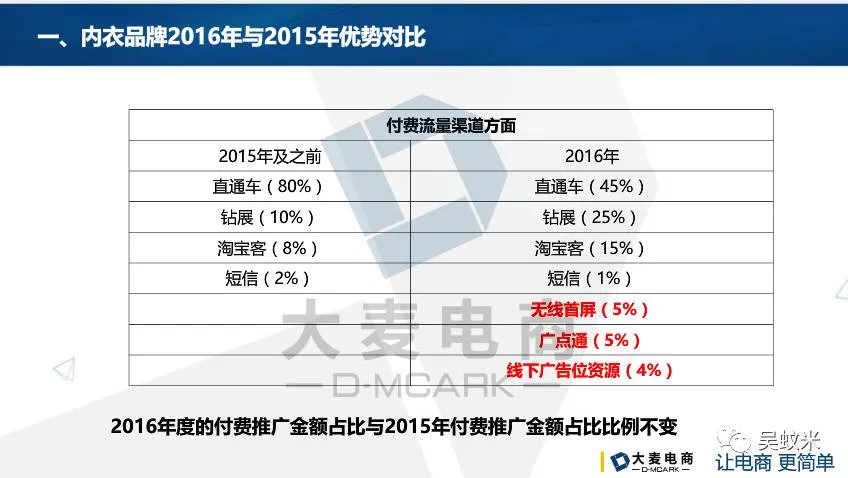 2016年的付费流量渠道做出调整,直通车占45%,钻展占25%,淘宝客占15%,短信1%,新增3个流量渠道,无线首屏占5%,广点通占5%(站外),不难发现,站外推广费用比2015年增加了许多,原因在于消费者对于第三方平台的信任度比往年有所提高。有研究表明,同一个产品在同一位消费者面前出现超过5次,她的购买欲望就会变强,所以商家可以依据这个原理,通过站外流量让消费者与产品产生联系。线下广告位资源4%,这是和泡芙小姐合作,置换线下广告资源,例如公交站站台,地铁站贴上品牌广告语。
