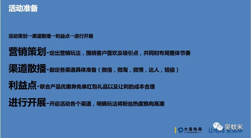 做全渠道散播,包括微信、微淘、微博、短信、视频、直播、其他站外流量。以微信传播节奏和各位蚊子会会员做分享。