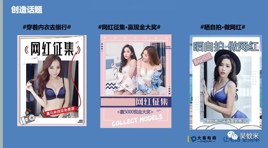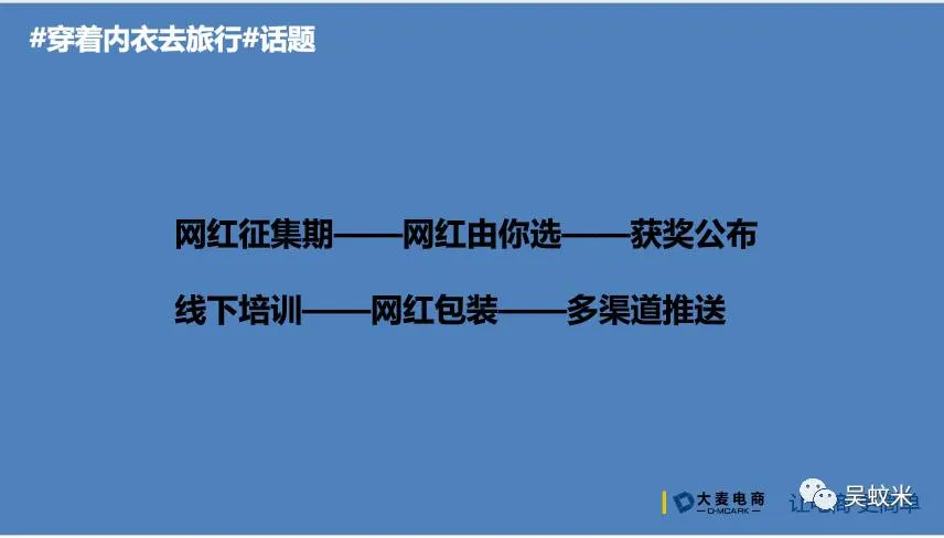 一个话题确认之后,将它分为6各阶段,第一阶段,网红征集期,目的在于告诉消费者活动流程、意义和奖励,让粉丝参与到活动中来,在微信公号、微博、社群进行宣传;第二阶段,网红由你选,将征集到的图片放到微淘和店铺页面中进行评选;第三阶段,获奖公布,第一名直接去马来西亚旅游,第二三名奖励就会少一些,送购物券或者别的礼品;第四阶段,线下培训,3个月一场,累积三个月的粉丝一起做线下培训;第五阶段,网红包装,签约合格粉丝,在店内做过度,前期将粉丝的照片作为买家秀,后期可以拍摄一些内衣的辅色图片,让买家渐渐有一个接受过度的过程;第六阶段,多渠道推送,将自己培养的模特介绍给旗下其他店铺的作为拍摄主角。