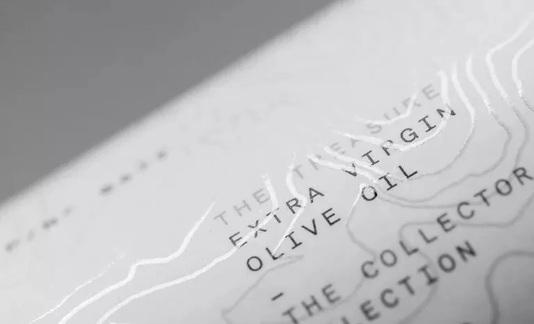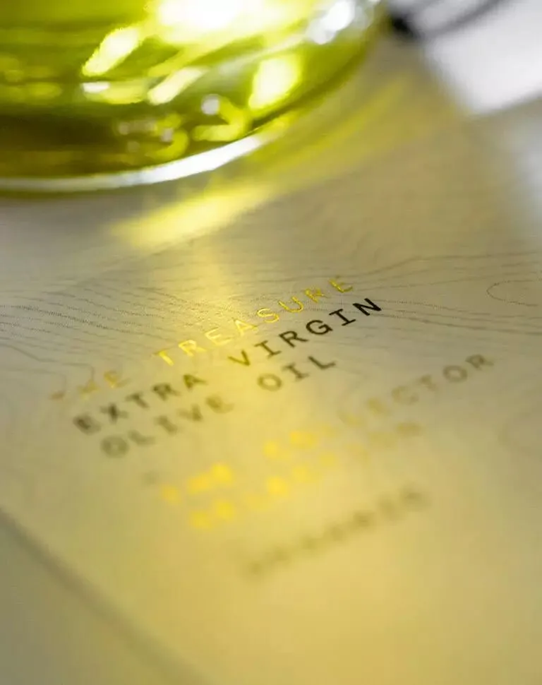 说明书上的特殊工艺、地图提炼出来的图形相互结合,在作为装饰的同时也表达出优质橄榄油宝藏来自不同的地区。由于产地的不同,让客户乐于在里面寻找他们想要看到的一切。
