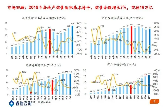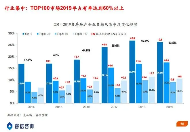 以上是一些简单的政策回顾,我们看一下市场的表现。其实我们统计了前十名的销售额在15年当中的复合增长,我们回顾过去的15年,可以说真的是中国房地产行业的黄金发展时间,它的复合增长率实际上接近了40%。我们看到,前100强在市场的增速也是非常快的,在2014年的时是整体的市场占有率的不到40%,在2019年的时候达到60%以上。尤其是在2016、17、18年这3年中,可以说是跨越式的一个增长,增速非常的快。到2019年,实际上有一个放缓的趋势,这跟整体行业增长放缓也有相应的关系。