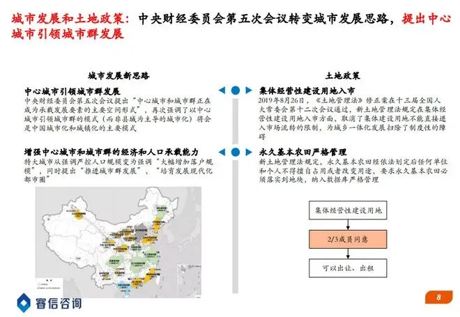 除了这些城市之外,其他的一些城市承担国防安全、粮食安全和环保这样的三个职能。那样,实际上更加深入地明确了本次城镇化过程中,以人口转移为核心的城镇化的特点;城市群的发展,以中心城市为主的城市群的发展将带动下一步的发展。可见,后面人口的流动和产业的发展其实也延续这样的趋势。从经济的角度来讲,我们统计下来是经济在区域中聚化的效应,是进一步的加强,继续向核心城市群聚集。这点,从数据上看很明显,在整个的数据中,前8大的城市群和未来将增加五个点左右的数量,在整个全国GDP的占比中,达到大概77.6%的比例。这个比例,实际上相当于经济发展基础更好的区域,下一步的增速会更强;而经济基础弱的区域相对会减速,而且是南强北弱,这种格局会更加的明显。