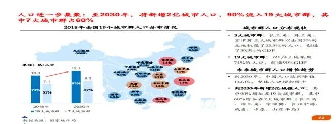 从人口聚集来讲,我们统计是2020年到2030年这十年之间未来大概会新增2亿人口。其中90%流入19大城市群,当然,这其中最核心的七大城市群,,像京津冀、长三角珠三角、中原城市群、长江中游城市群、山东半岛,还有成渝区域,我们看下来,未来会占到新增流入的这些人口的60%。这也是我们房地产企业的重点关注的一些区域和地方。